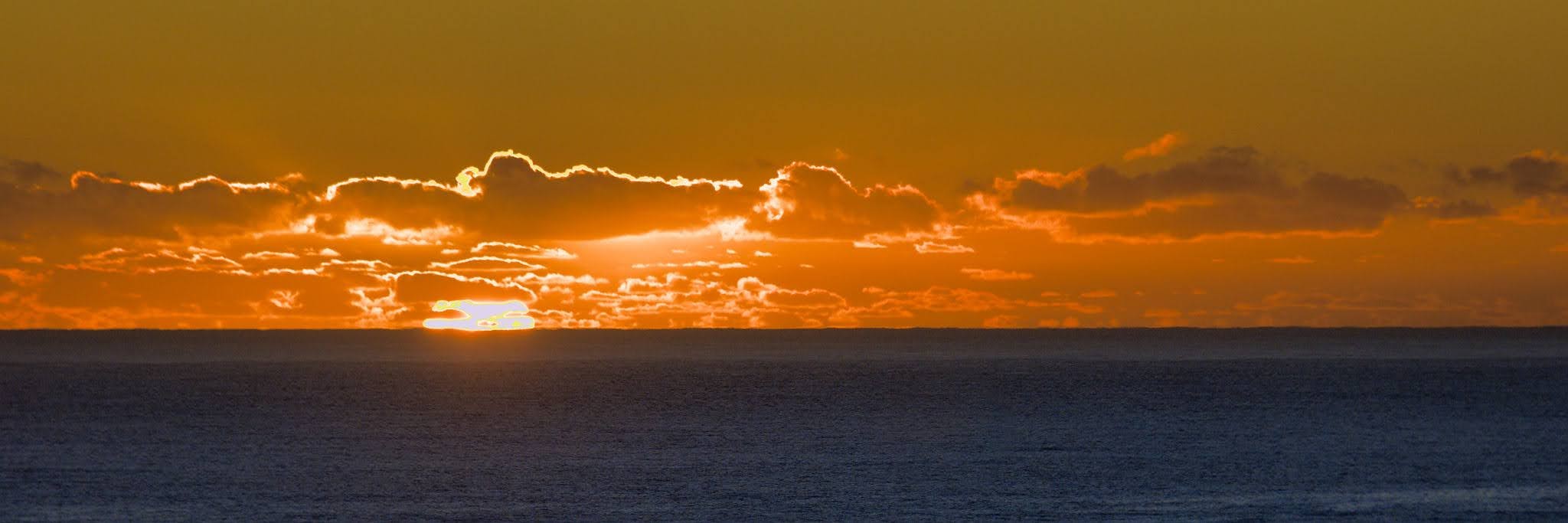The sun is still below the horizon but it is lighting up the clouds to announce that it is about to burst out of the sea.